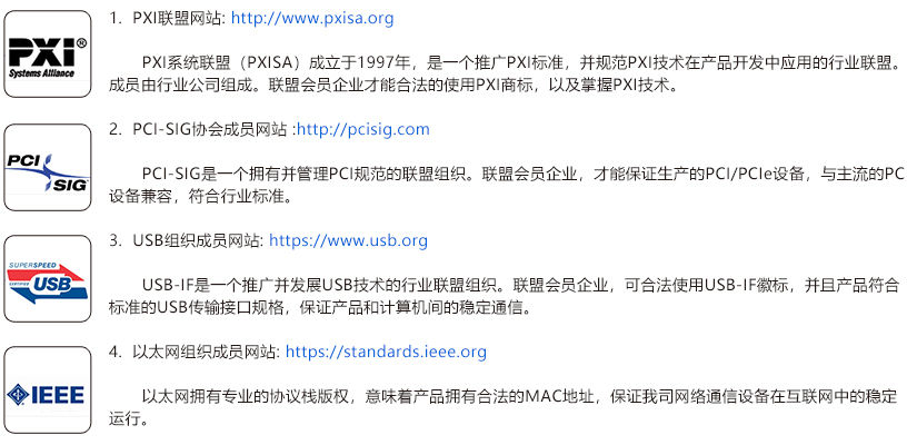 我公司是PXISA、USB-IF 和PCI-SIG联盟的会员,以太网总线拥有专业协议栈版权,获批加入各联盟组织,意味着我司可以掌握前沿的总线通信技术,和国际同行保持技术交流。